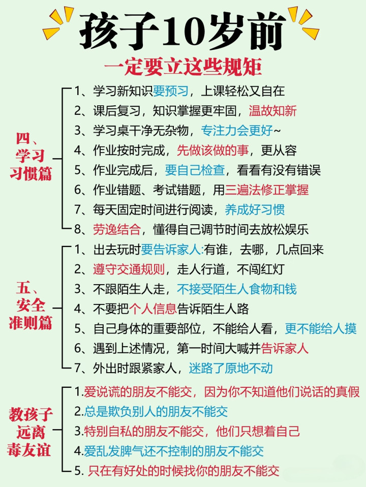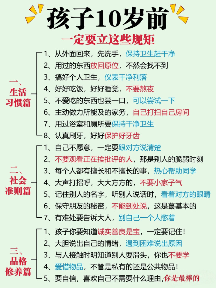 孩子十岁前,这些规矩会慢慢内化成他品格的一部分。等他长大后,他不会记得妈妈曾经制定过多少条“家规”,但他会成为一个情绪稳定、懂得尊重、敢于担当的人。这才是规矩给予孩子最珍贵的礼物——不是束缚他的框架,而是支撑他飞翔的力量。